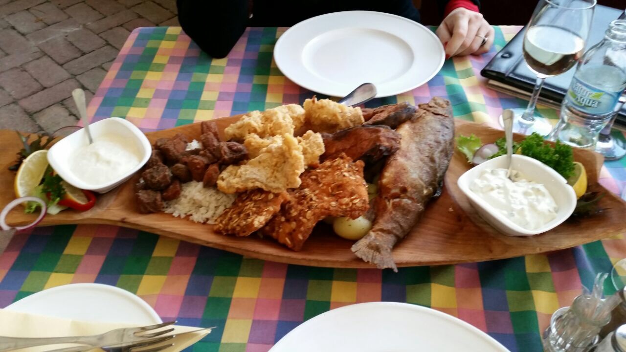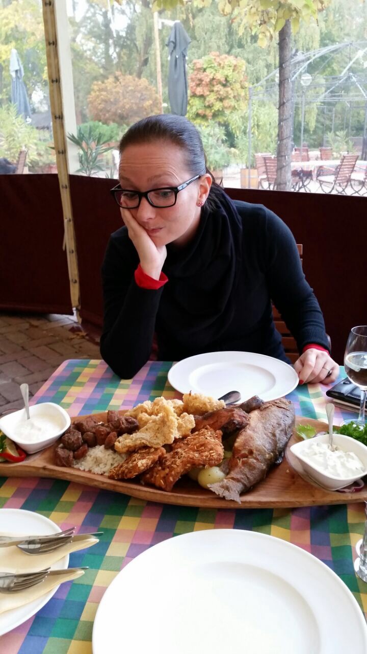 Da wir unsere Urlaube natürlich auch immer mit einer kulinarischen Expedition in die jeweiligen Landesküchen verbinden (wie den Fotos oft zu entnehmen…) gab es zum Ausklang eine leckere Fischplatte mit passendem Wein und Palinka 😉 in der Halaszcsarda hier im Ort. Wie immer viel zu viel, aber lecker!