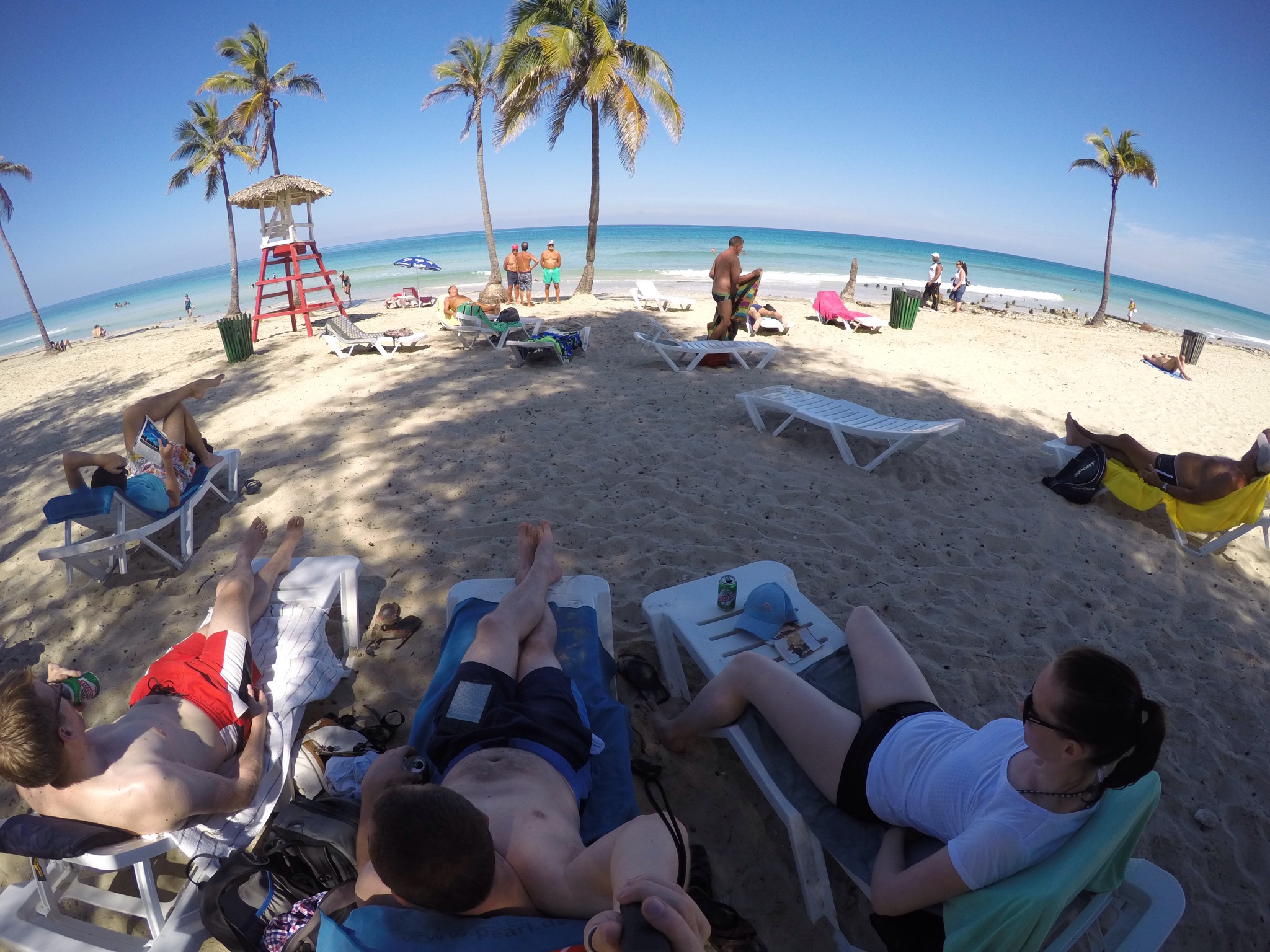Nach dem Frühstück (das übliche, Früchte, Saft, extrem starker Kaffee, Eier, ein wenig Wurst und Marmelade) ging es an den Strand. Dort haben wir dann auch bis zum späten Nachmittag rumgelungert. Sandstrand, Kristall klares Wasser, Palmen und viele alte Männer mit Kesselartigen Bäuchen. Willkommen in der Karibik. 🙂 War alles recht gechillt. Die Preise für die Liegen waren anständig (2 CUC pro Tag) es gab gleich einen Laden in dem man Getränke kaufen konnte um die Ecke und keine aufdringlichen Leute die einen die ganze Zeit genervt haben (Verkaufen / Betteln).