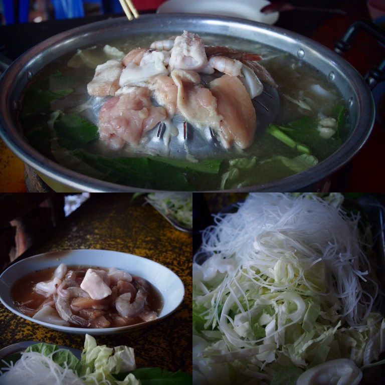 Da gerade Mittagszeit war sind wir zu einem nahen Restaurant am Fluß gelaufen und haben dort ein Thailändisches BBQ (oder auch Korean BBQ genannt) gemacht. Wie das funktioniert seht ihr in etwa auf den Bildern. Der Tip von Herbert war also super! Das wollten wir diesen Urlaub sowieso noch machen und ich vermute auf Koh Chang könnte das kompliziert werden. Hier war es auf jeden Fall sehr gut und günstig.