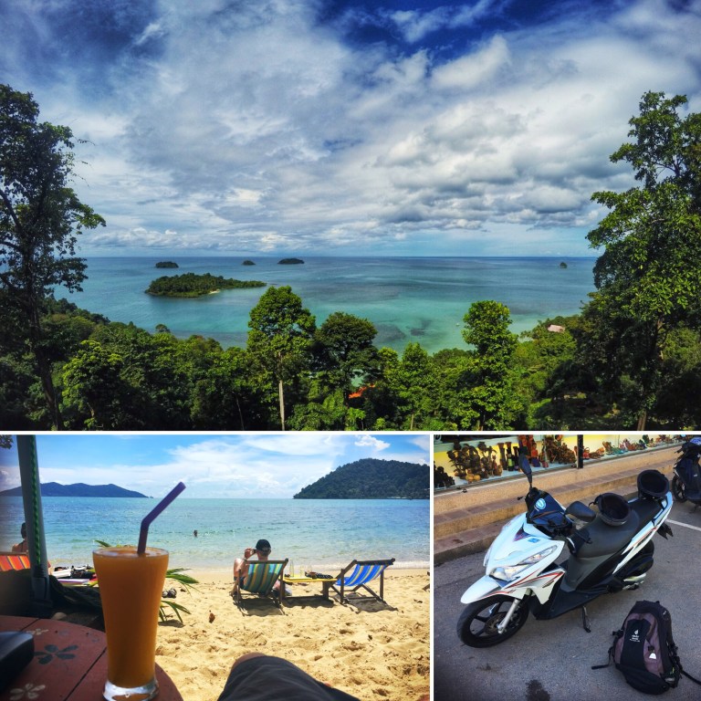 Das schauen was so geht war heute ein Moped ausleihen und ein wenig über die Insel düsen. Wir haben erstmal ein 125CC Monster von Honda für 24h gewählt (250 Baht) und sind dann in unsere erste gemeinsame Fahrt (überhaupt!) über die extrem bergige und kurvenreiche Insel gestartet. Der erste Stop war eine sehr chillige Hippibar direkt am Strand im Süden der Insel. Ich muss den Namen mal noch in Erfahrung bringen aber die können wir wirklich empfehlen. Netter kleiner Strand, coole Mucke, nette Leute und vernünftige Preis.