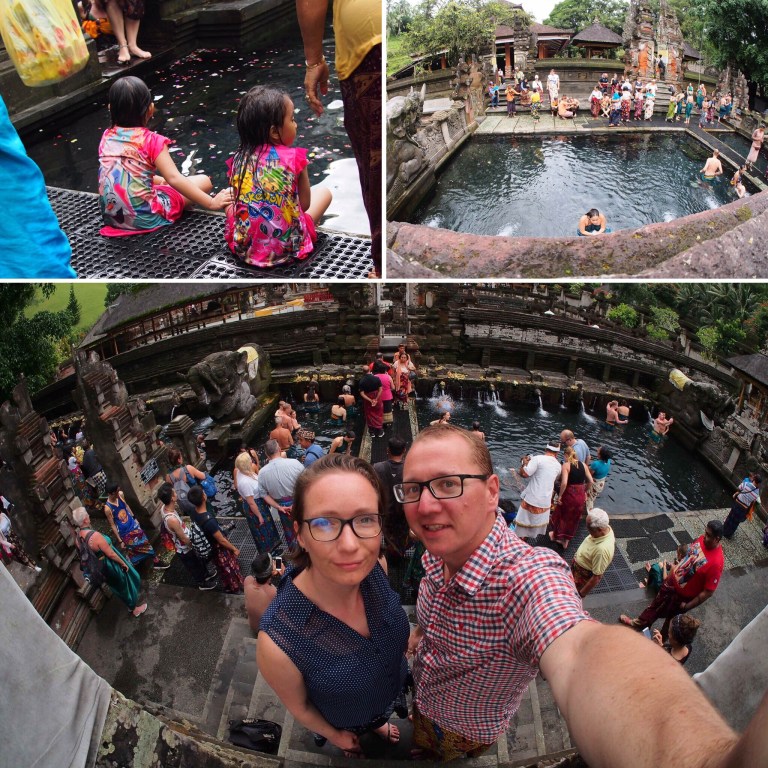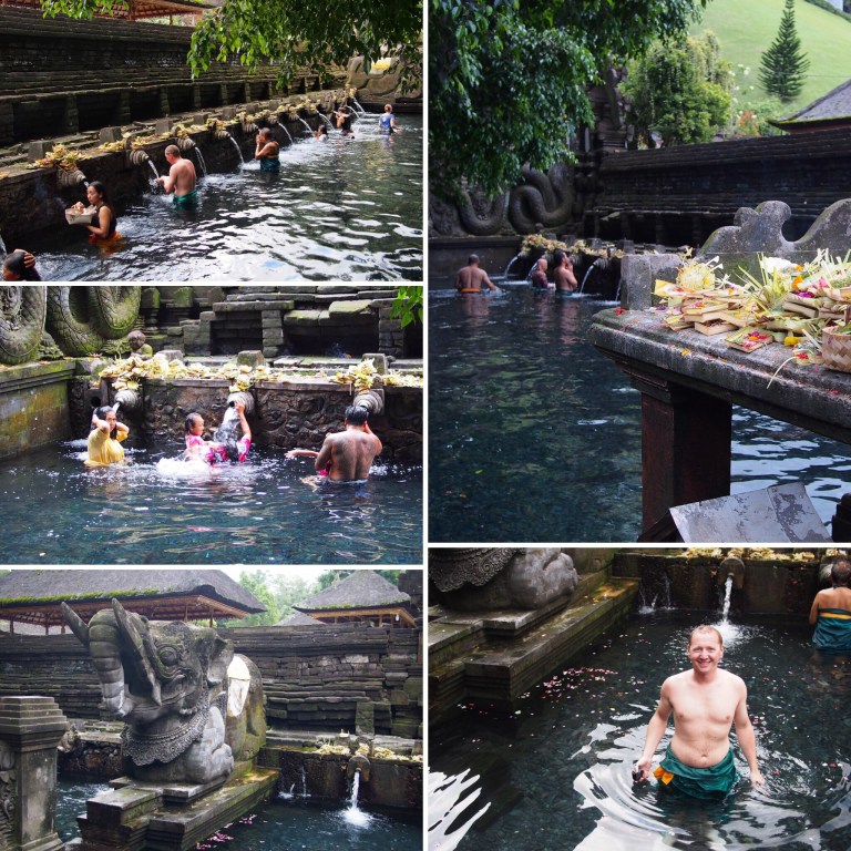 So gestärkt haben wir uns auf den Weg in die Berge gemacht und sind mit unserem Raketenmoped in Richtung Ubud aufgebrochen. Allerdings diesmal nicht direkt nach Ubud sondern zu 2 Tempeln die etwas nördlich davon liegen. Der erste war „Pura Tirta Empul“ ein Wassertempel der bekannt für seine heiligen Quellen ist.