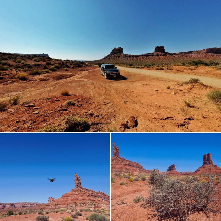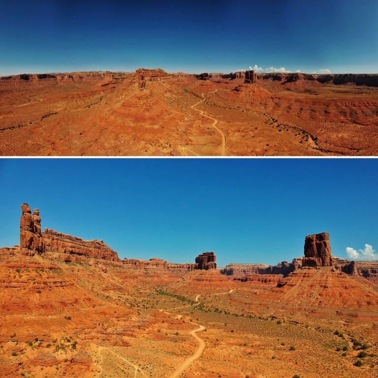 Anschließend ging es über eine Schotterpiste die am Fuße oben besagtem Tafelbergs liegt gut 30 Minuten hin eins ins „Valley of the Gods“. Auch Sehenswert aber der Muley Point ist etwas besser. Im Valley kommt man den bekannten Bergen eben etwas näher… auf der Schotterpiste tummeln sich aber allerhand Touris, unter anderem auch mit riesigen Wohnmobilen wodurch das Fahren immer mal etwas nervig wird… weil man ständig an die Seite fahren muss.