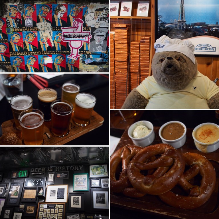 Einmal um das Museum of Pop Culture und die Space Needle, durch den Olypmic Sculpture Park, entlang am Pier zum Pike Place Market um dort erst mal Mac‘n Cheese reimzumampfen, dann noch zum ersten Starbucks der Welt und zur Gum Wall. Jetzt mussten wir erst mal in der Pike Brewing Company eine Pause einlegen. Sehr zu empfehlen der Laden! Quasi ein Museum des Bieres 😜.