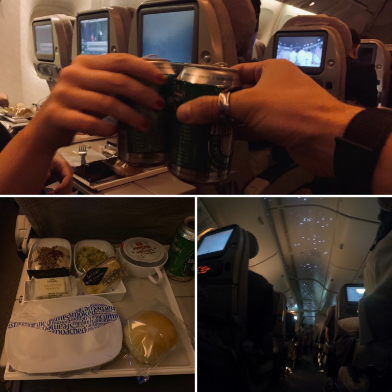 Der Flieger war auch auf dem neuesten Stand und so hatten wir riesige Bildschirme und leckeres Essen… welches wahlweise mit Heineken, Tiger, Stellar oder (in Franzi’s Fall) Gin-Tonic runter gespült werden konnte. Nur etwas frisch war es aber dafür gibt es ja die obligatorischen Decken…