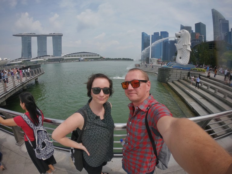 Als wir fertig waren mit Essen war aber auch der Wolkenbruch fertig und wir konnten weiter durch die Gassen schlendern. Weiter sind wir zum Kolonialen Viertel und von dort zum „Merlion“ einem komischen Springbrunnen in Gestalt einer Löwenmeerjungfrau. Aber Ausblick dort war ganz nett, nur die vielen Leute haben genervt…