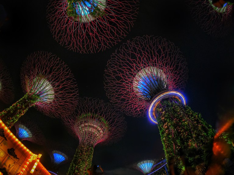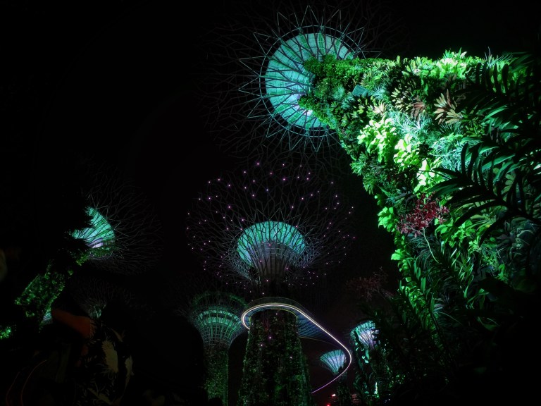 Nach dieser Stärkung sind wir noch mal in Richtung Marina Bay Sands aufgebrochen um dort in den „Supertree Grove“ zu gehen. Im Dunkeln sieht das hier alles noch einmal ganz anders aus und wird auch toll illuminiert. Besonders wenn man zu einer der Lightshows (19:45 und 20:45) hier ist. Eintritt kostet diese Attraktion nicht.