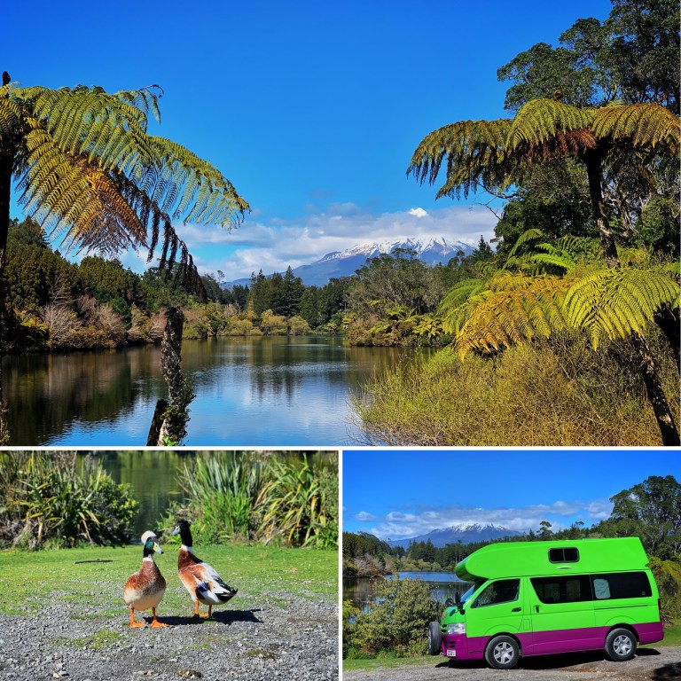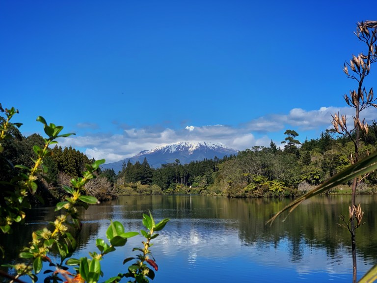 Heute wieder entspannter… aufstehen, duschen, Frühstück mit Blick auf das Meer neben dem Juicy und dann los zum Lake Mangamahoe um von hier den Mount Taranaki zu bewundern.