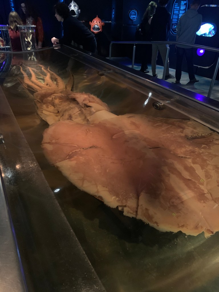 Erst waren wir in einer Ausstellung über die Flora und Fauna von Neuseeland. Alles sehr interaktiv und so aufbereitet, dass es Spaك macht sich alles anzuschauen und auszuprobieren. Unter anderem gab es einen Erdbebensimulator in Form eines kleinen Hauses in das man reingehen konnte, diverse Exponate zum anfassen, riesige interaktive Wände, den grِössten ausgestellten Octopus der Welt, Videos für Kinder wie man am besten Possums und Ratten tötet und vieles mehr.