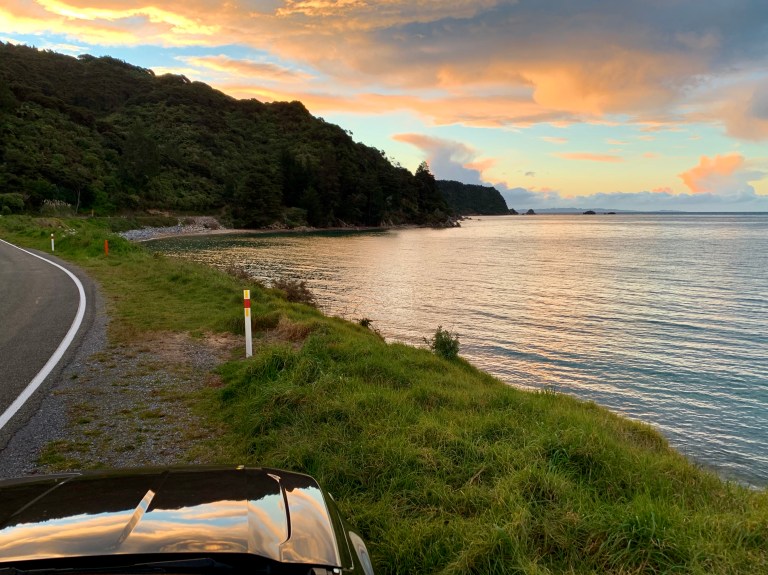 Nach dem Frühstück haben wir uns also auf den Weg nach Totaranui gemacht. Ein unweit von unserer Unterkunft gelegener Campingplatz und Ausgangspunkt diverser Wanderwege. Die Anfahrt war schon spannend denn zu erreichen ist der Campingplatz nur über eine sehr kurvige geschotterte Bergstraße. Glücklicherweise haben wir ja das richtige Auto für so etwas ✌🏼.