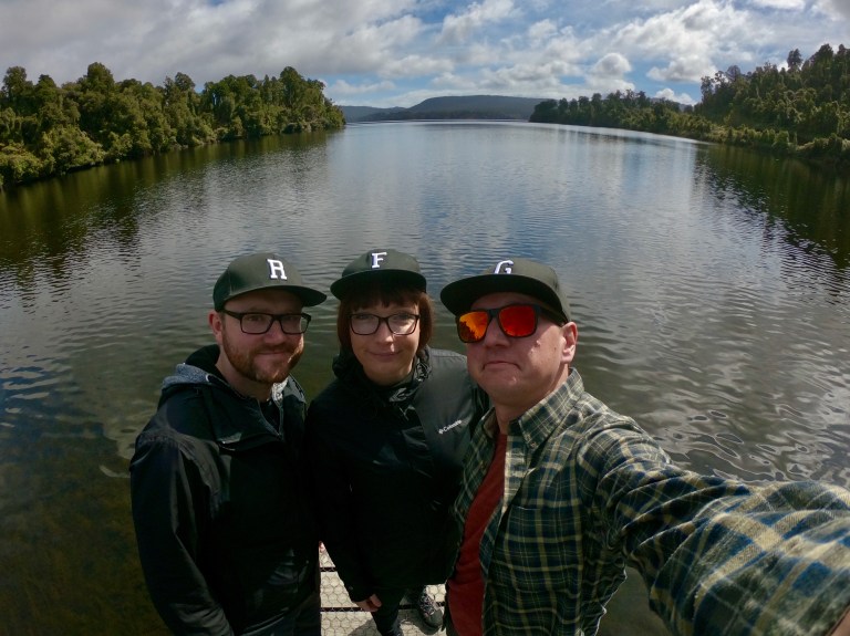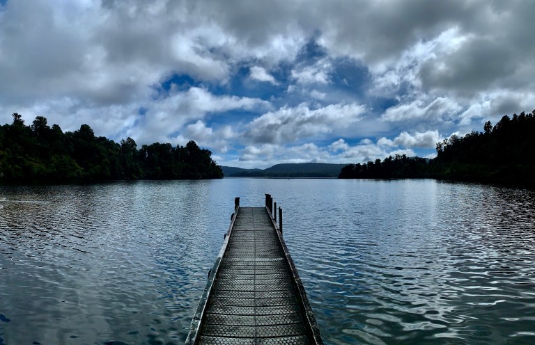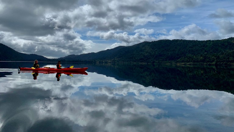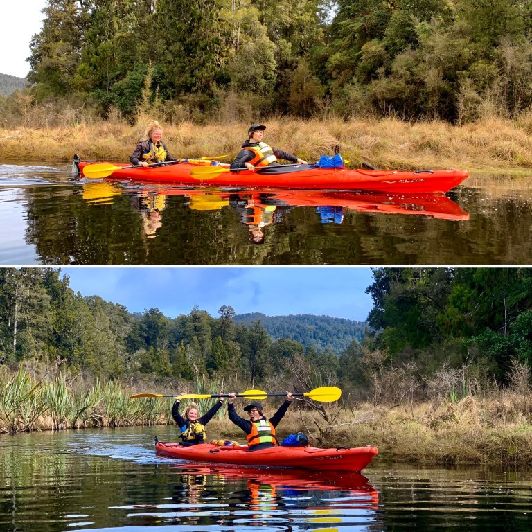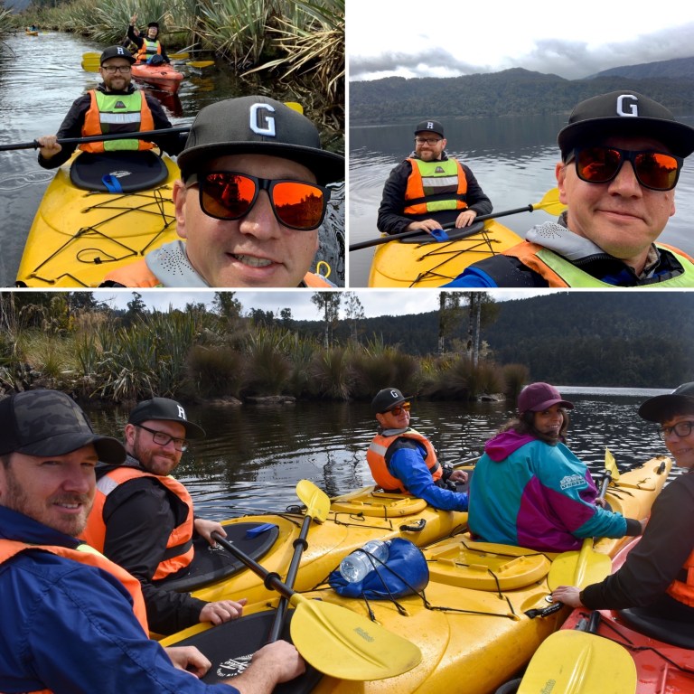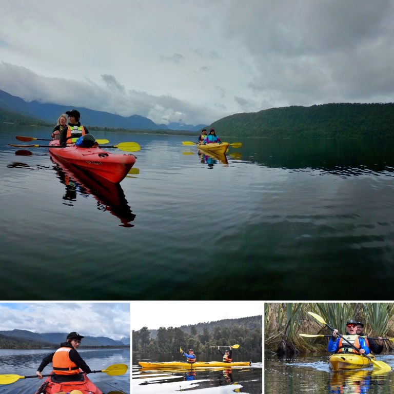 Also los auf den See Mapourika und erst einmal 2,5 km bis ans andere Ufer. Da ich mit Robert im Hochgeschwindigkeitskajak saß kamen wir auch kaum ins schwitzen… dort ging es dann entlang eines Waldes der die gleiche Vegetation aufweist wie diese schon zu den Zeiten der Dinosaurier zu finden war bis zur „Echobucht“.