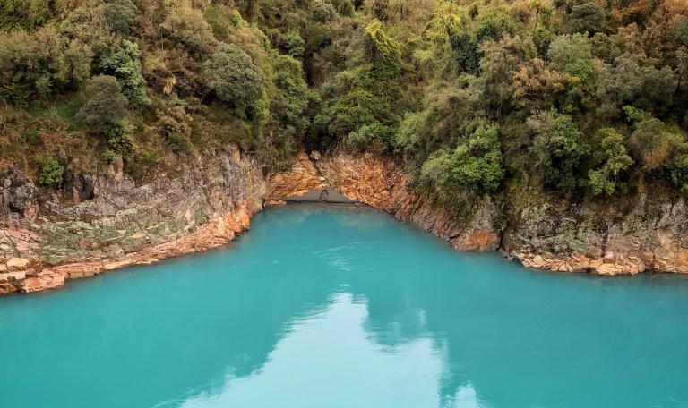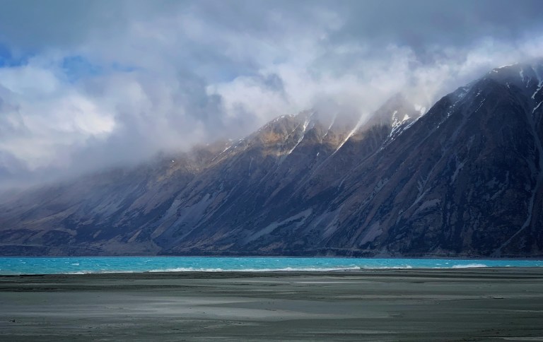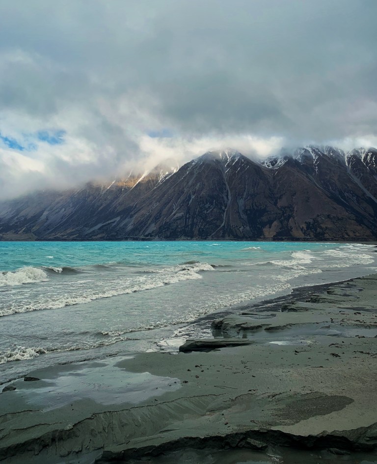 Der Regen hatte aufgehört und auch die Wolken haben sich etwas aufgelockert und so hat sich die Natur von einer ihrer schönsten Seiten gezeigt. Ein leuchtend türkisblauer See vor riesigen, teilweise wolkenverhangenen Bergen.