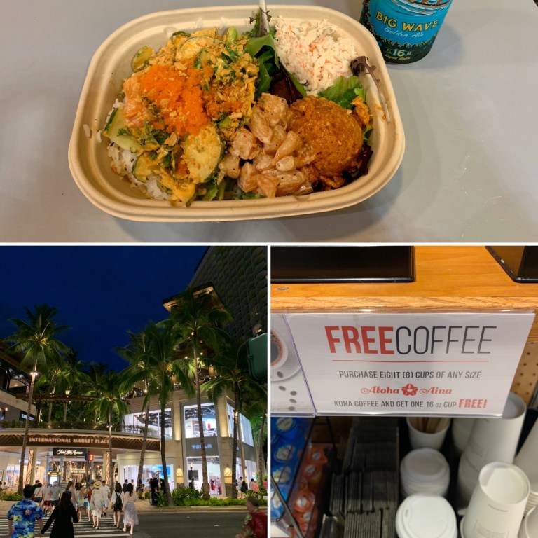 Es ging dann ganz entspannt erst einmal zum „Poke“ Dealer um die Ecke, um uns dort so eine leckere Schüssel mit dem Hawaiianischen Nationalgericht zu holen. Echt gutes Zeug – quasi ein Bausatz für Sushi, den man ähnlich wie bei Subways kauft. Man wählt eine Sorte Reis, eine oder mehrere Sorten (rohen) Fisch, eine Soße bzw. Beilage und noch ein Topping (Kaviar, Knoblauch, …) und bekommt dies dann mehr oder weniger vermischt in einer Schüssel serviert. Sehr sehr lecker.