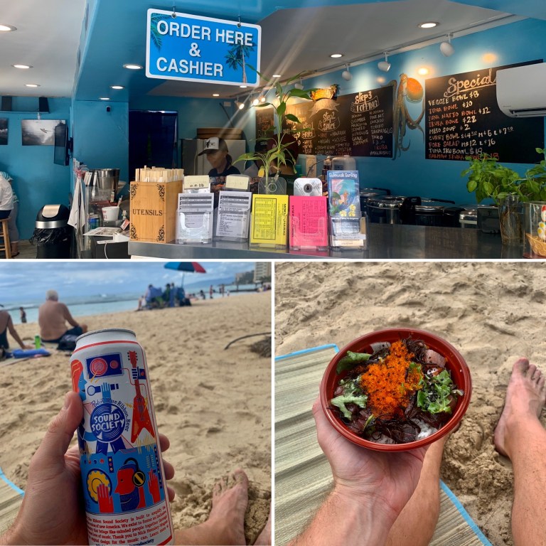 So sind wir nach einem Abstecher in die Unterkunft wieder zurück an den Strand und dort zu einer Strandbar (Duke‘s Waikiki) auf ein Sonnenuntergangsbier. Der Sonnenuntergang ist wegen Wolken ausgefallen aber Bier gab es… Von hier sind wir dann zu einer anderen Poke Bar und haben uns noch mal jeder so eine leckere Schüssel einverleibt.