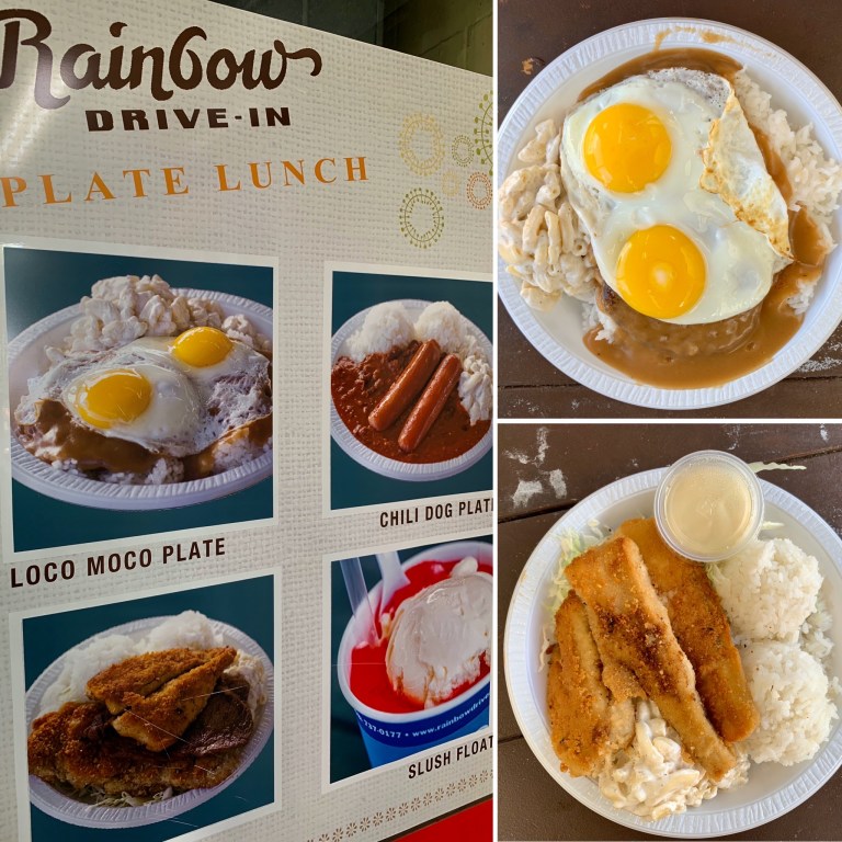 Als erstes sind wir zum „Rainbow Drive In“ gelaufen, um dort zu Frühstücken. Hier kommt wohl Herr Obama auch immer hin, wenn er auf O‘ahu ist. Der Drive In ist eigentlich eine Art Imbiss, in dem „einheimische“ Gerichte Angeboten werden. So habe ich mich vormittags auch schon an eine „Loco Moco Platte“ herangetraut. Diese bestand aus Reis, Nudelsalat, 2 Burgerpatties, Soße und zwei Spiegeleiern…. seltsame Kombination aber ganz ok. Bei Franzi gab es Makrele zum Frühstück… 🙂