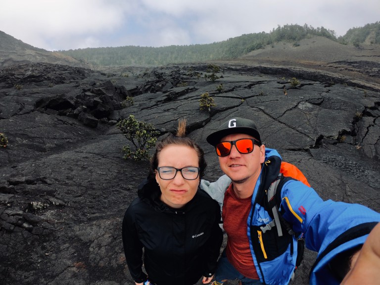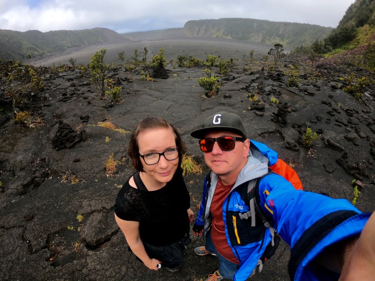Aufgrund des Wetters war uns allerdings noch nicht so richtig klar, was wir machen wollen. Entweder mit dem Auto den „Crater Rim Drive“ abfahren, oder eine Wanderung auf dem „Kilauea Iki Trail“… naja am Ende haben wir natürlich beides gemacht. Gestartet sind wir also am Aussichtspunkt des durchaus schon beeindruckenden Kilauea Iki Kraters (und das ist noch lange nicht der größte Krater hier). Von hier ging es erst einmal entlang der Kraterwand durch den Dschungel, bis dann der Weg relativ zügig in Serpentinen bergab fiel und uns auf den riesigen erkalteten Lavasee führte. Dieser ist noch gar nicht so alt… Er wurde bei einem Ausbruch 1959 geschaffen und ist stattliche 120 Meter tief!