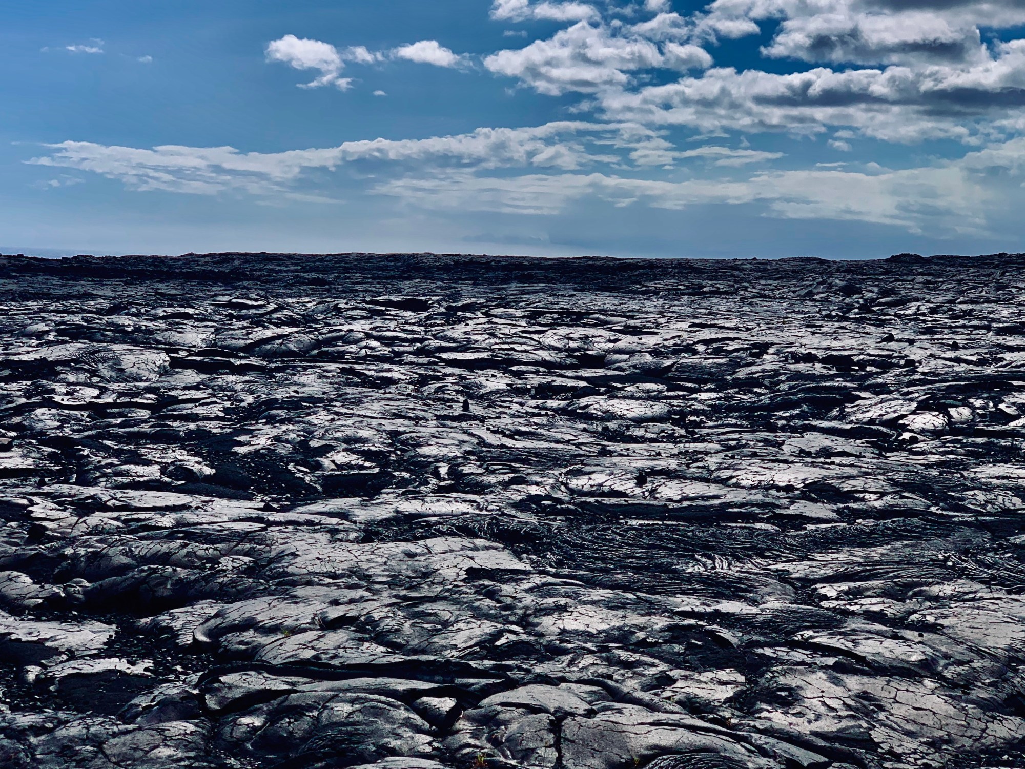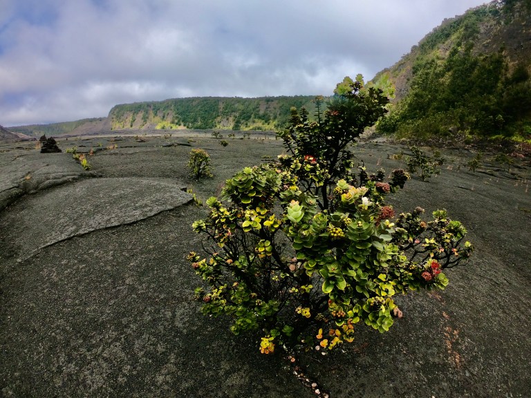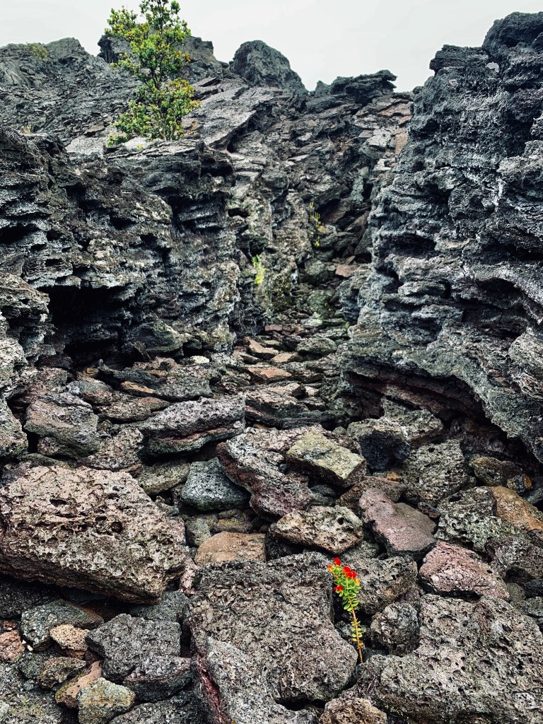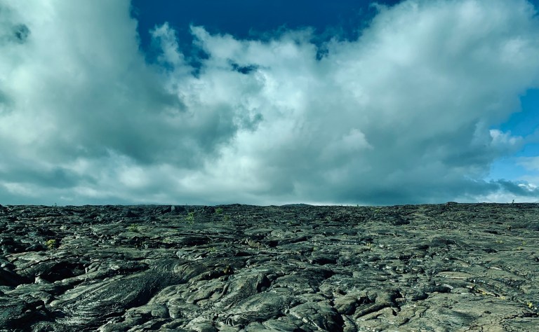 Wieder am Parkplatz angekommen, hat es stärker angefangen zu Regnen und so sind wir wieder schnell ins Auto gehüpft, haben uns erst einmal mit den mitgebrachten Eierbroten gestärkt und sind dann den oben erwähnten „Crater Rim Drive“ entlang gefahren. Das sollte man auf jeden Fall machen, wenn man hier ist. Diese Straße führt entlang vieler Krater und Aussichtspunkte, von denen auch kleine und größere Wanderwege abgehen. Man fährt durch riesige Lavafelder, durch eine langsam wieder ergrünende Natur und steht am Ende am Meer. Sehr abgefahren und man kann gar nicht realisieren was hier einmal passiert sein muss bei diesen gigantischen Lavaströmen. Das Wetter hat auf dieser rund 45 minütigen Fahrt noch mehrfach die Meinung gewechselt und so waren es, als wir am Ende der Straße standen um die 30 Grad und Sonnenschein…