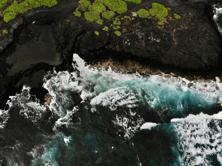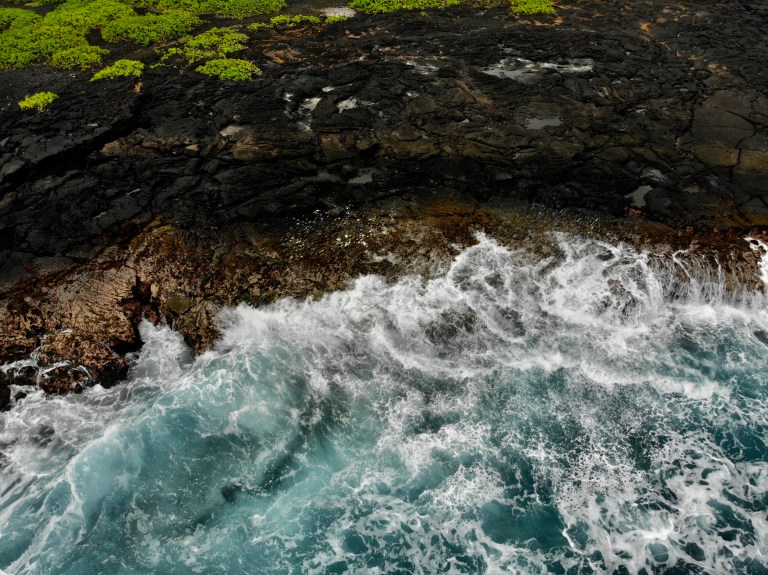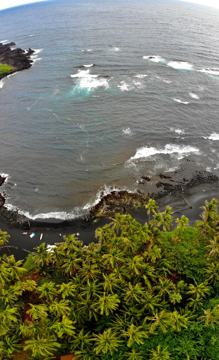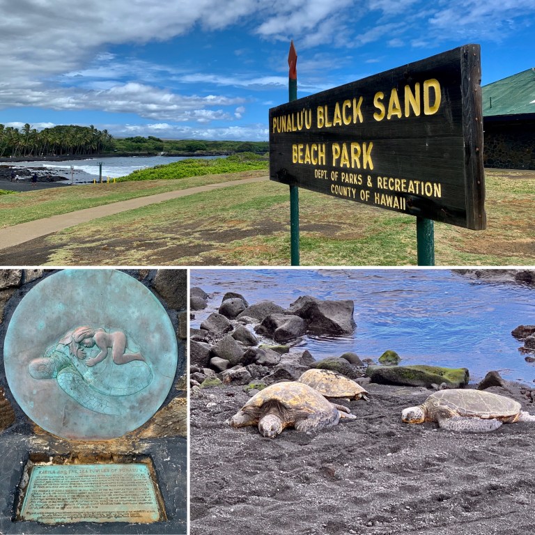 An den Punalu‘u Black Sands Beach. Wie man vermuten könnte, gibt es hier schwarzen Sand… und Meeresschildkröten. Die kommen nämlich hierher, um sich zu sonnen. So auch heute, vier Stück lagen faul am Strand herum und mussten für zahlreiche Schaulustige als Fotomotiv herhalten.