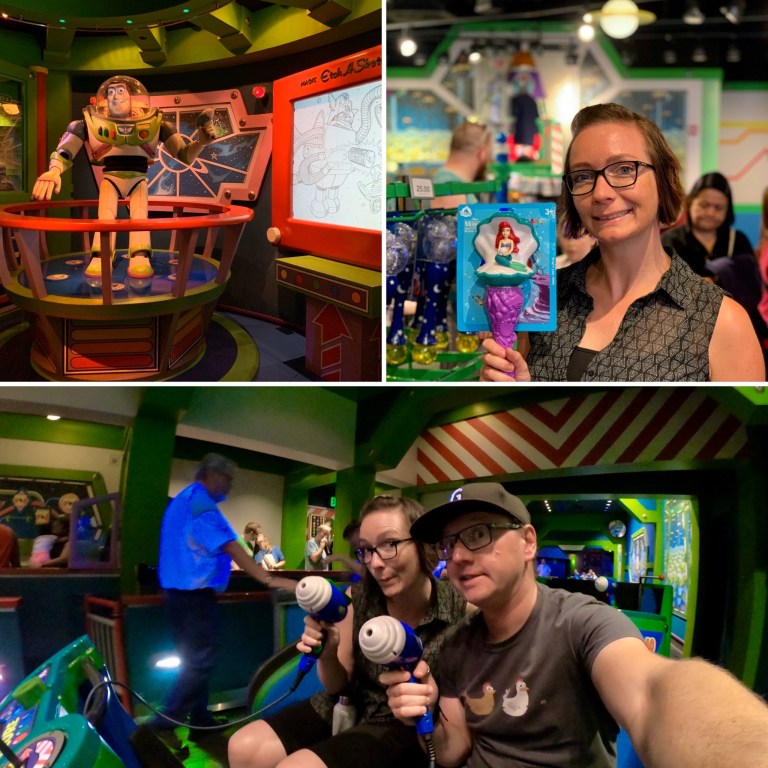 Drinnen angekommen muss man erst einmal durch einen riesigen Shopping- und Restaurant-Bereich laufen (Disney Downtown), bevor man überhaupt zum Eingang des Parks kommt. Der Park war schon gut gefüllt, als wir dann drinnen waren und das an einem Dienstagvormittag… am krassesten fanden wir aber, wie die Amerikaner dieses Disney zelebrieren. Jeder hat entweder ein T-Shirt von Disney an, einen blöden Hut auf, ist verkleidet, hat irgendwelche Sammelpins oder anderen KrimsKrams dabei. Gut, einkaufen kann man hier eben auch ohne Ende. Quasi überall findet man Geschäfte, in denen man nahezu alles bekommt. Von der lebensgroßen Darth Vader Statue bis zum Mickey Maus Stoßstangenaufkleber gibt es alles.