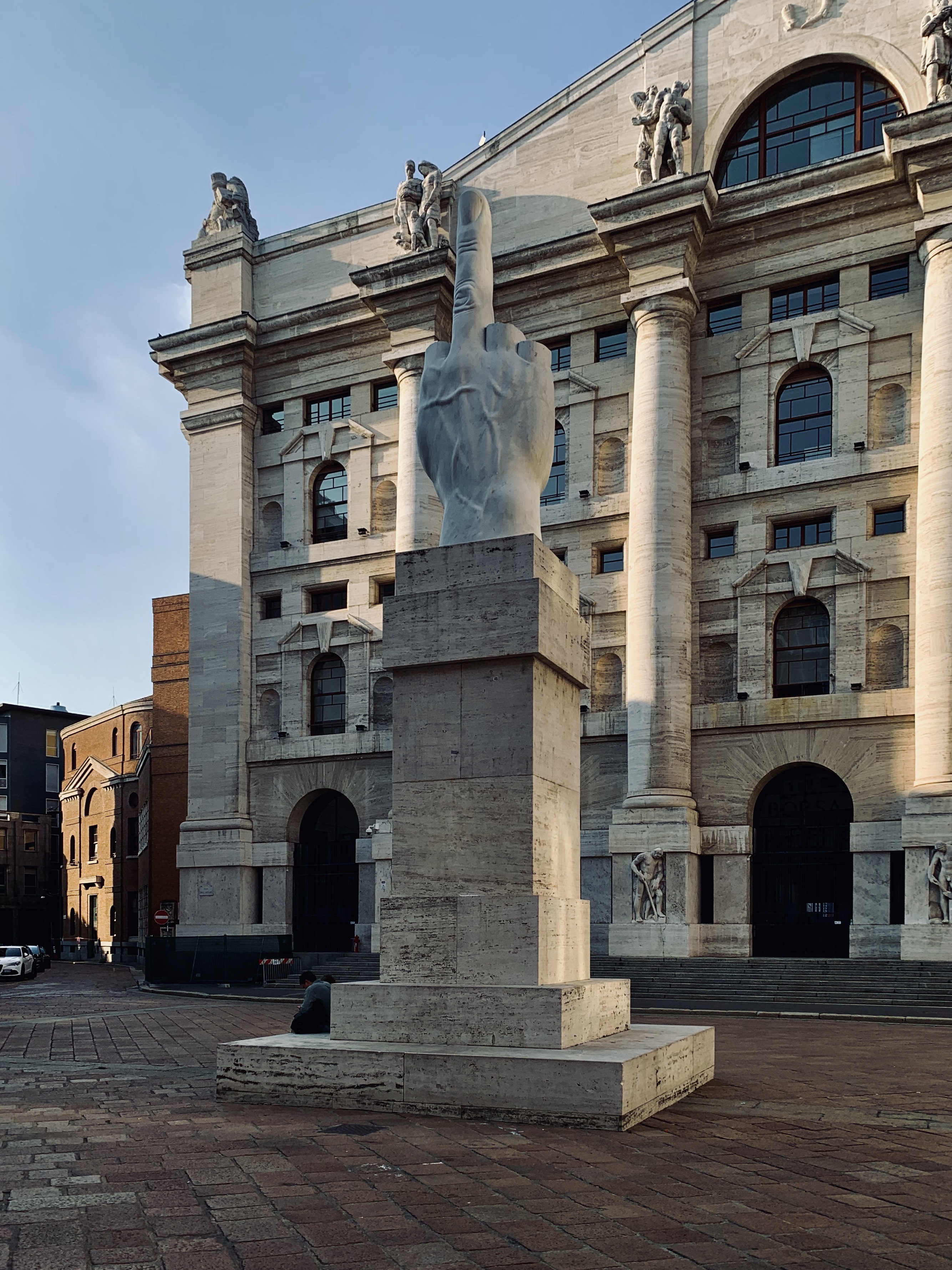 Weiter dann zum vermutlich größten Mittelfinger der Welt. Dieser steht als Statue direkt vor der Börse in Mailand. Sollte man gesehen haben.