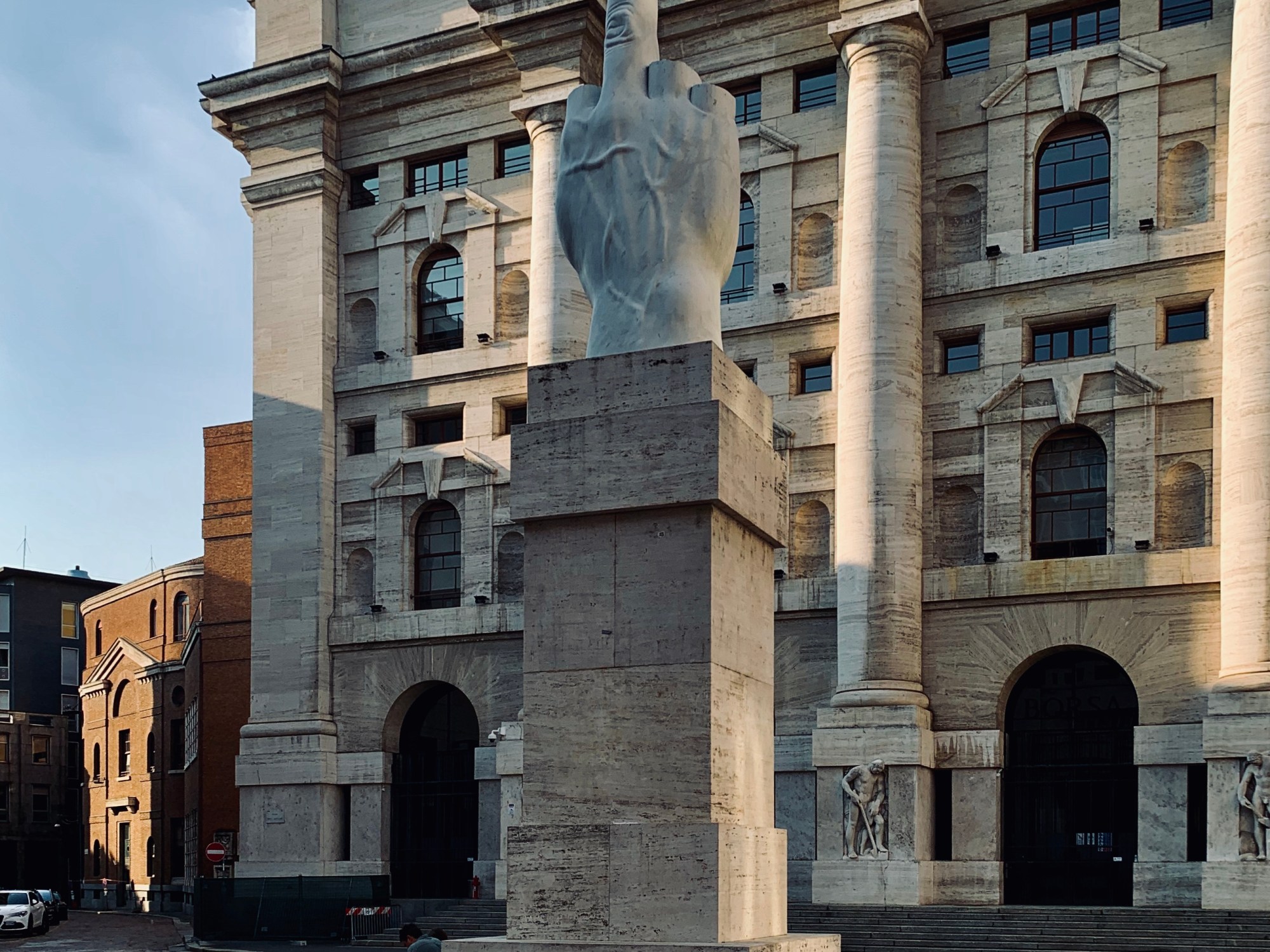 Weiter dann zum vermutlich größten Mittelfinger der Welt. Dieser steht als Statue direkt vor der Börse in Mailand. Sollte man gesehen haben.