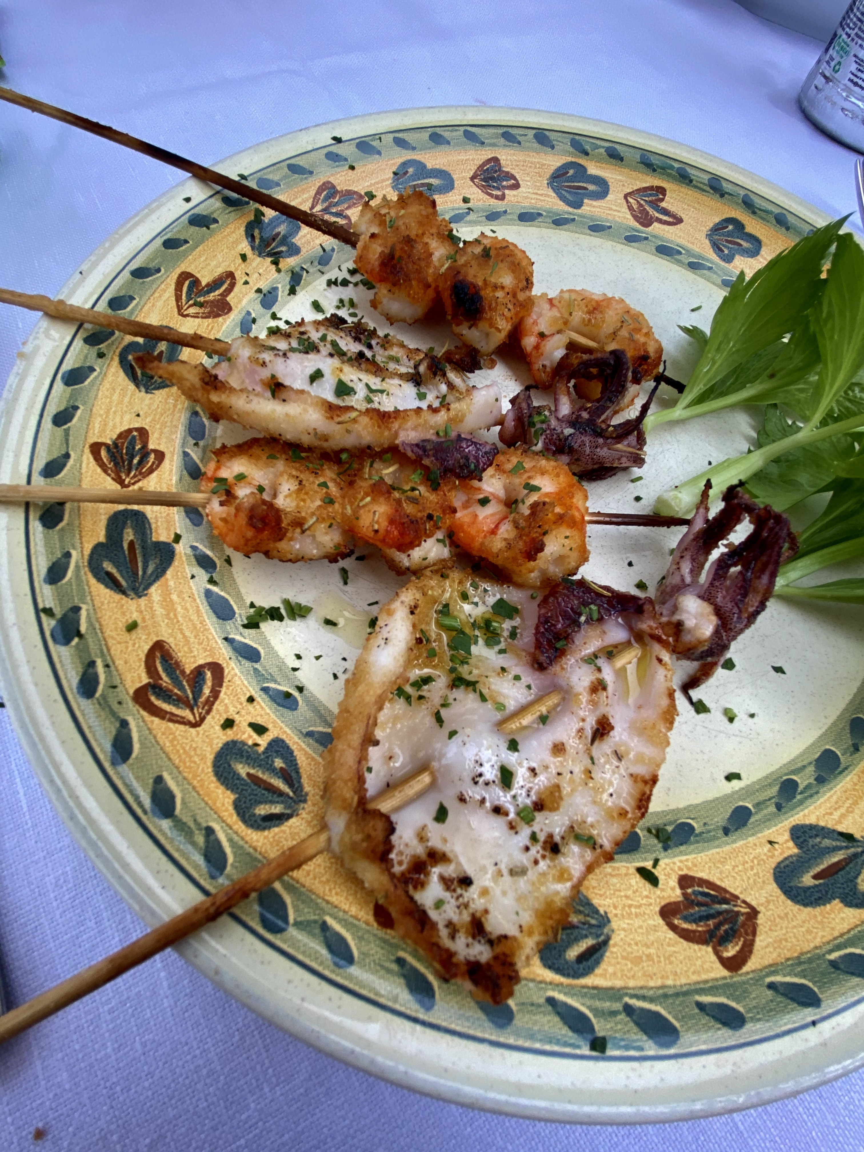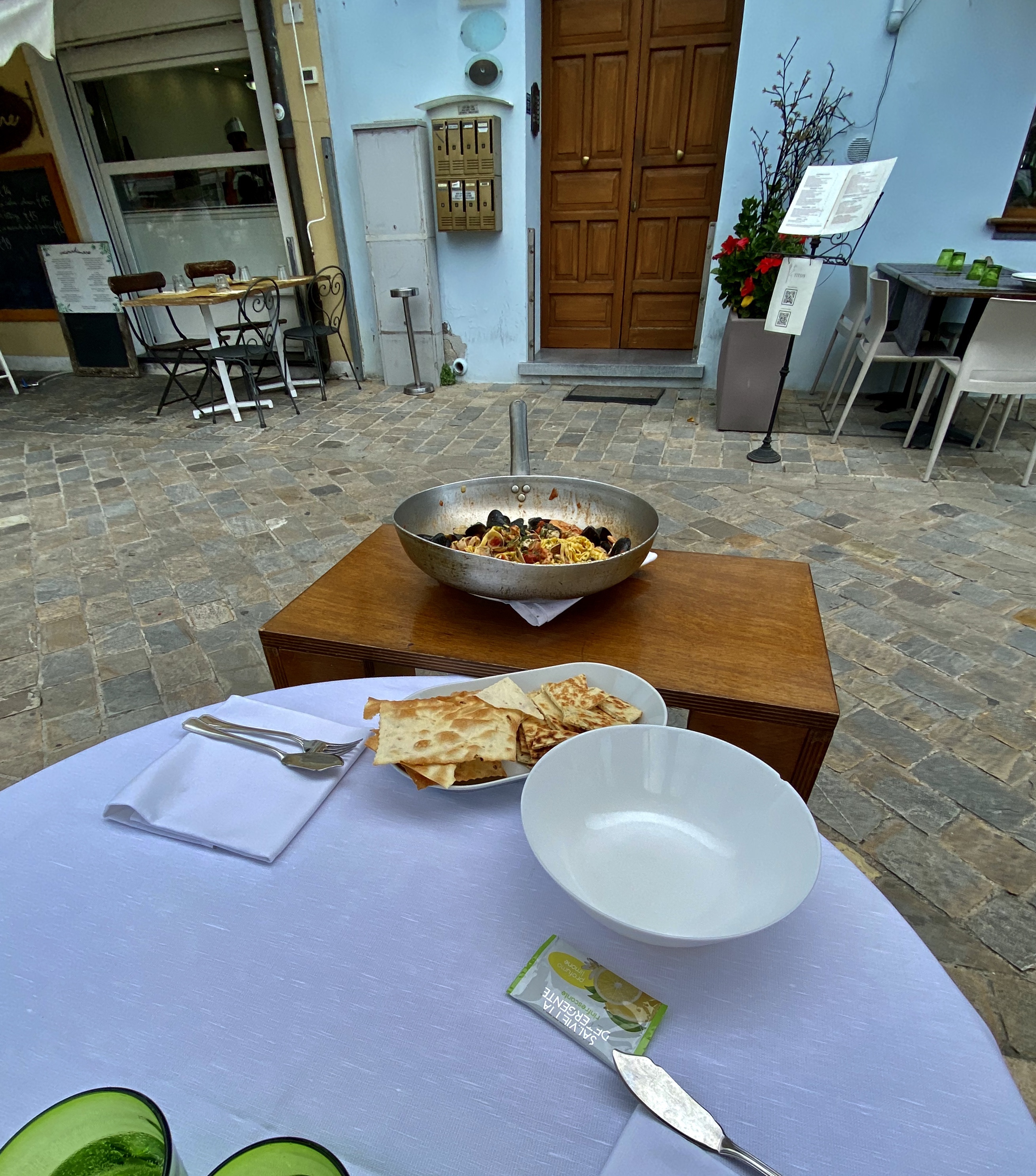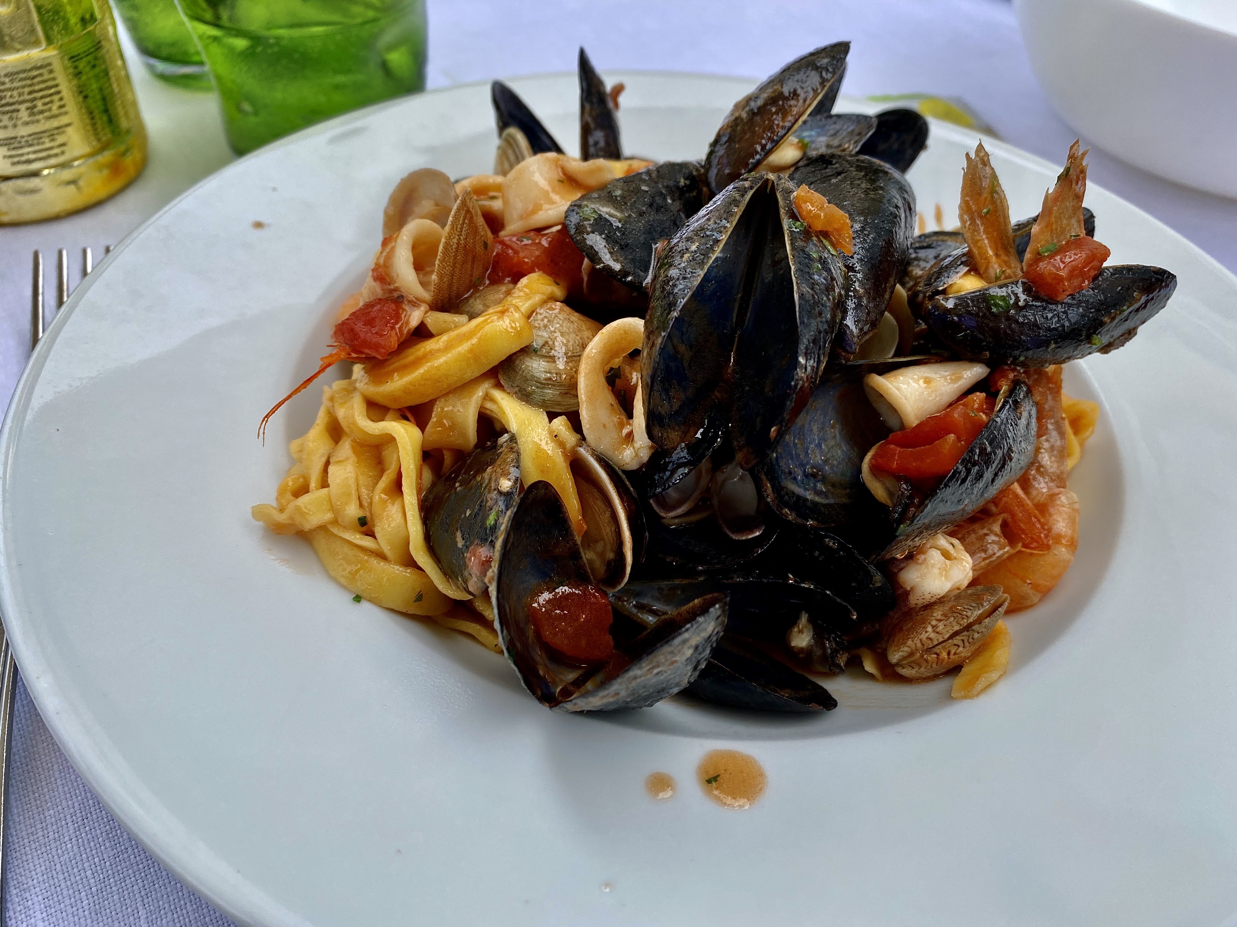 Besichtigt haben ihr hier nicht viel, aber sehr lecker Mittag gegessen. Nudeln mit Meeresfrüchten und anschließend noch Spieße mit Meeresfrüchten. Im Menu mit Coperto und Wasser für 20€ p.P. ein ganz vernünftiger Deal.