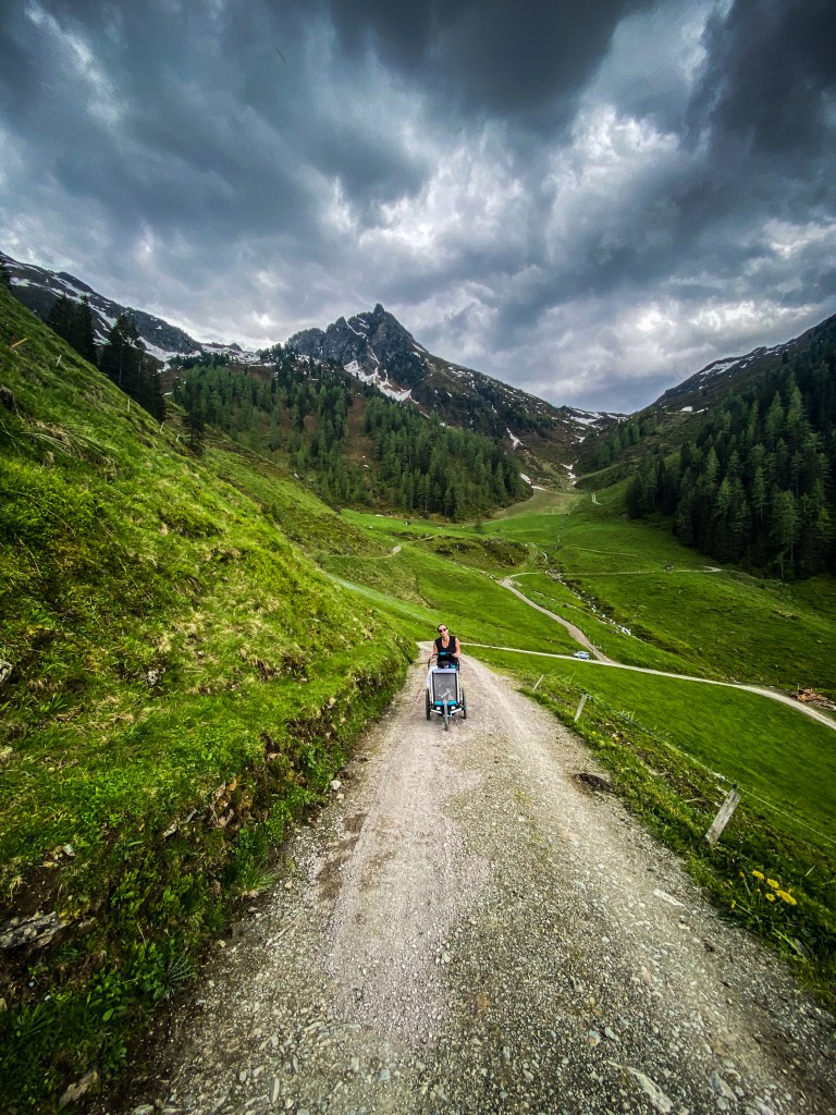Das Ziel sollte die Farmkehralm sein. Der Wanderweg auf Komoot las sich sehr einfach, also auch machbar mit einem Thule Kinderbuggy. Also nix wie hin und die nur 10 Minuten Anreise bis zum Startpunkt waren auch sehr gut. Dort angekommen haben wir Edgar in seine „Sänfte“ gepackt und sind los gestiefelt. Am Anfang mit mäßigem Erfolg, erst hat Komoot eine schlechte GPS Verbindung und dann sind wir auf Wegen gewandelt die es gar nicht mehr gab. Naja, dadurch sind wir mit dem Thule jetzt schon mal einen megasteilen Pfad hoch (dieser Punkt auf der Bucketlist kann also abgehakt werden) nur um diesen wenige Minuten später wieder retour zu gehen.