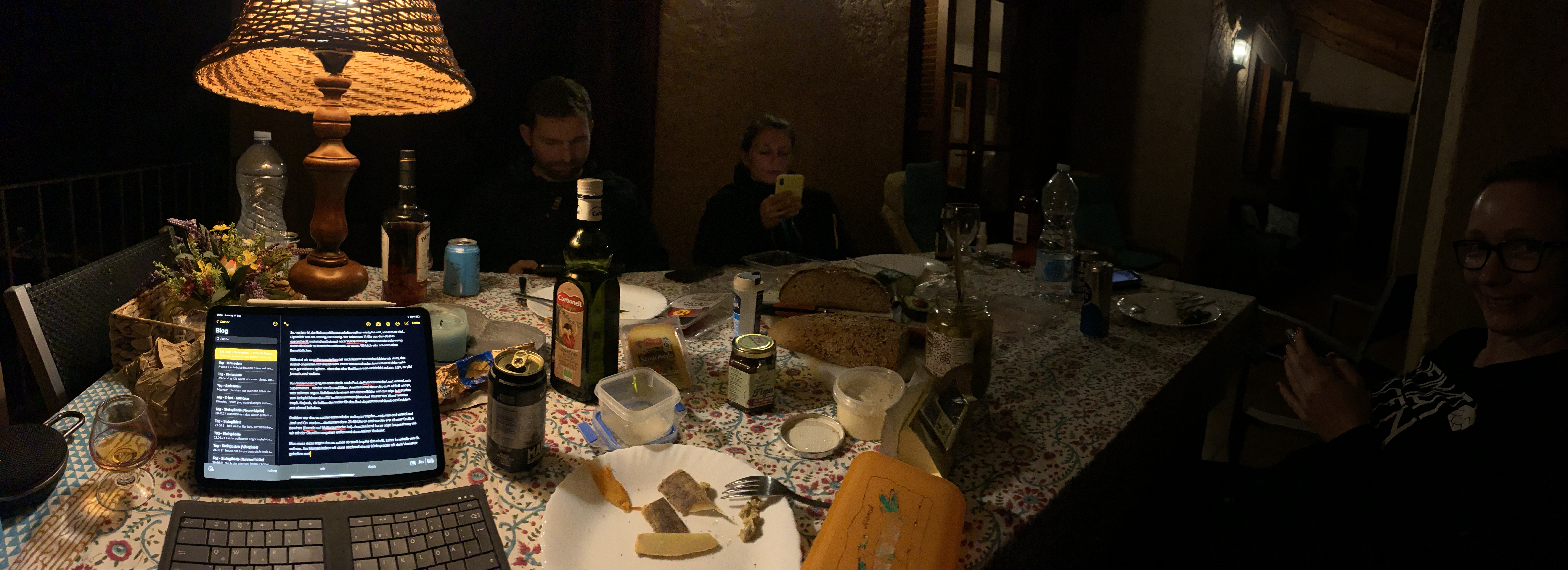 Problem war, dass es später dann wieder anfing zu tropfen… naja nun erst einmal auf Joni und Co. warten… die kamen dann 21:45 Uhr an und wurden erst einmal fürstlich bewirtet (Dorade auf Mallorquinische Art). Anschließend kurze Lagebesprechung, wie wir mit der Situation umgehen wollen und dann kleiner Umtrunk.