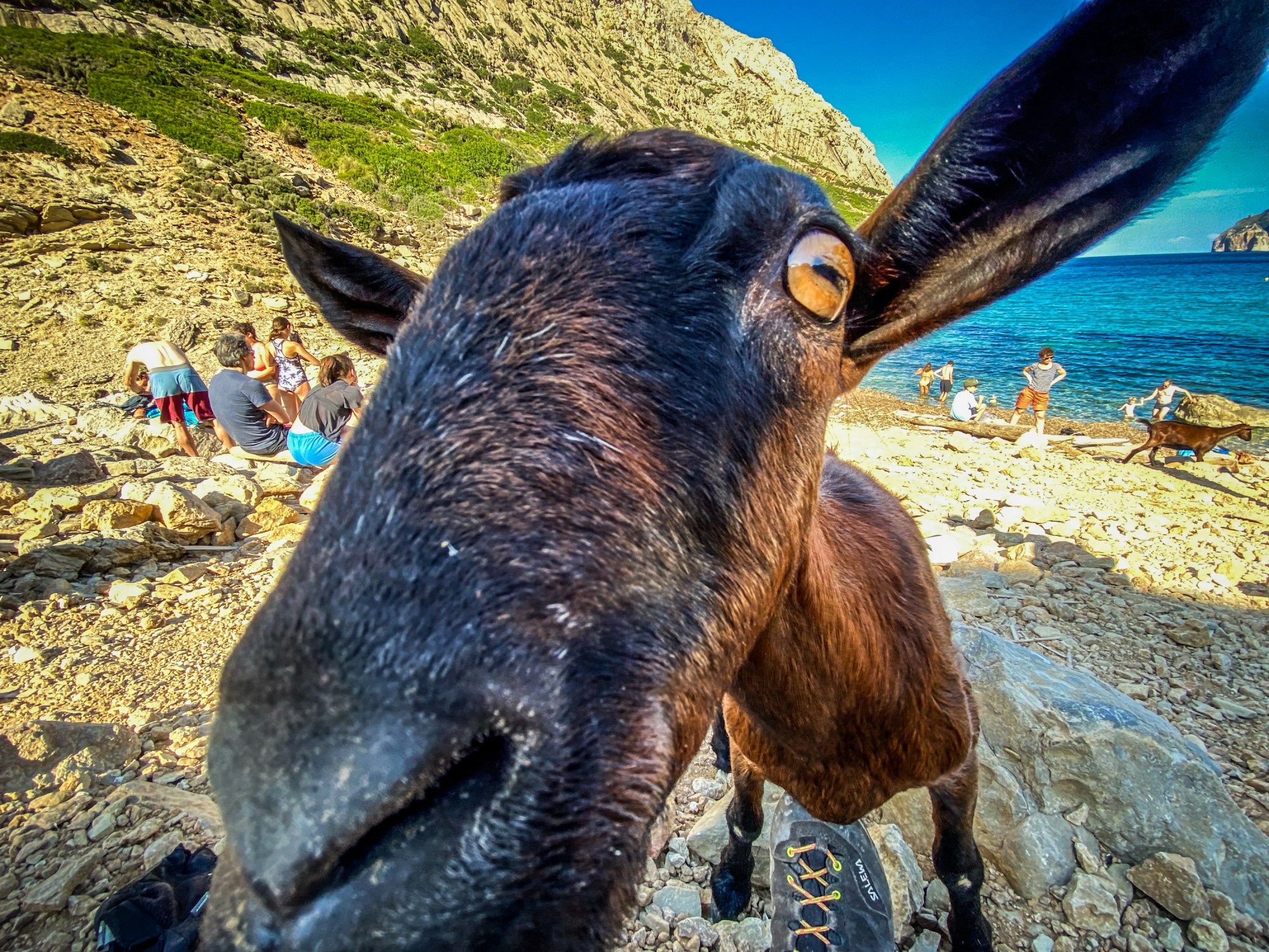 An der Bucht angekommen erwarten einen dann barbusige Frauen und Ziegen. Ach und auch kristallklares Wasser und ein toller Ausblick. Hier kann man schön eine Weile verbringen und wenn man entsprechende Kleidung dabei hat auch Baden gehen.