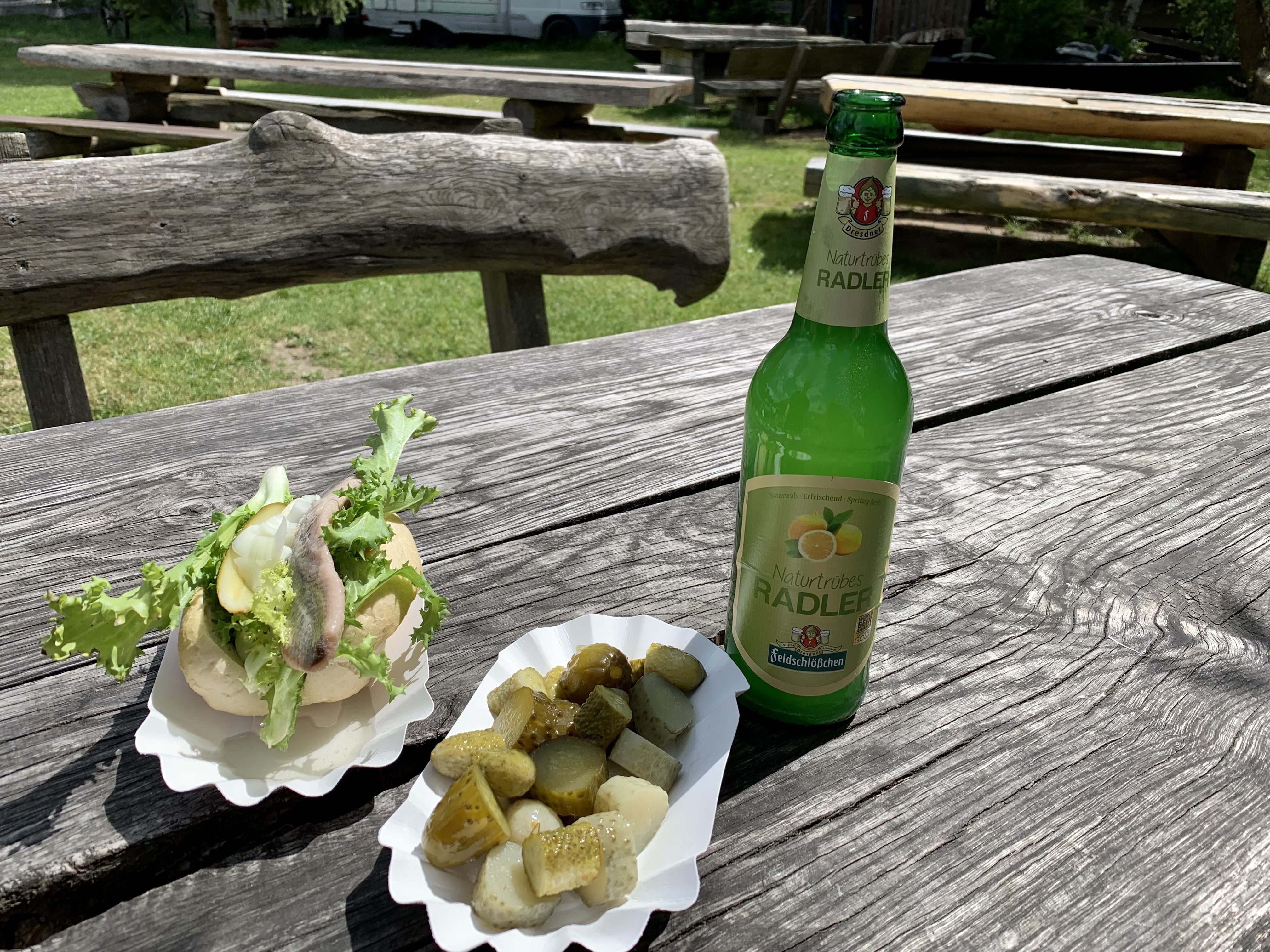 Von dort ging es weiter zum Hafen nach Burg auf einen Eiskaffee und eine Currywurst um dann wieder über kleine Umwege, dafür aber ausschließlich geteerte Straßen, zurück zur Unterkunft. Hier wurde zur Belohnung nach den 43km erst einmal das obligatorische Kaffee und Bier Gedeck eingenommen.