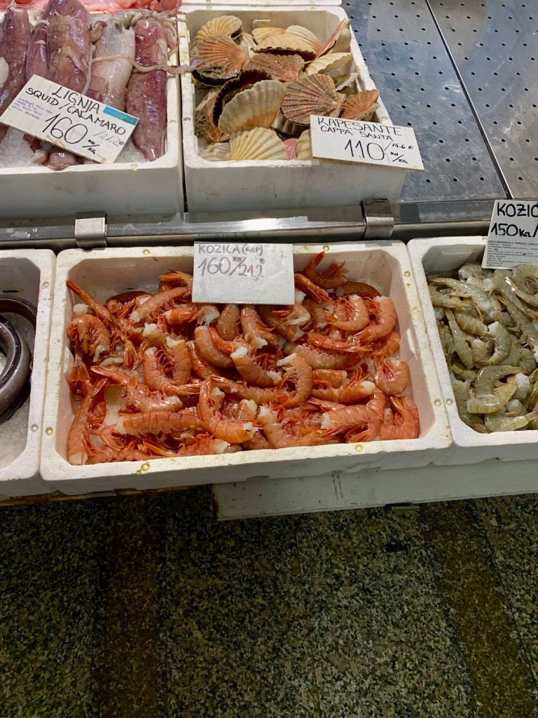 Nach der morgendlichen Routine haben wir uns heute einmal auf den Weg nach Pula und im speziellen dort zum Fischmarkt gemacht. Parken gestaltet sich in Pula nicht ganz einfach aber wir haben am Ende ein privates „Parkhaus“ in einem ehemaligen Kino gefunden in dem wir parken konnten.