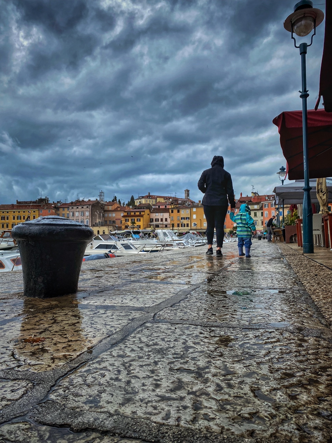 Nach dieser Stärkung ging es, unterbrochen von heftigen Regenschauern, auf einen Bummel durch Rovinj und hinauf zur Kirche der heiligen Euphemia, ein Bauwerk welches weithin sichtbar über der Stadt thront. Der Weg war durchaus relativ beschwerlich da wir mit dem Thule über mehrere Treppen mussten während uns Sturzbäche an Wasser entgegen kamen und das mitten in der Stadt!…
