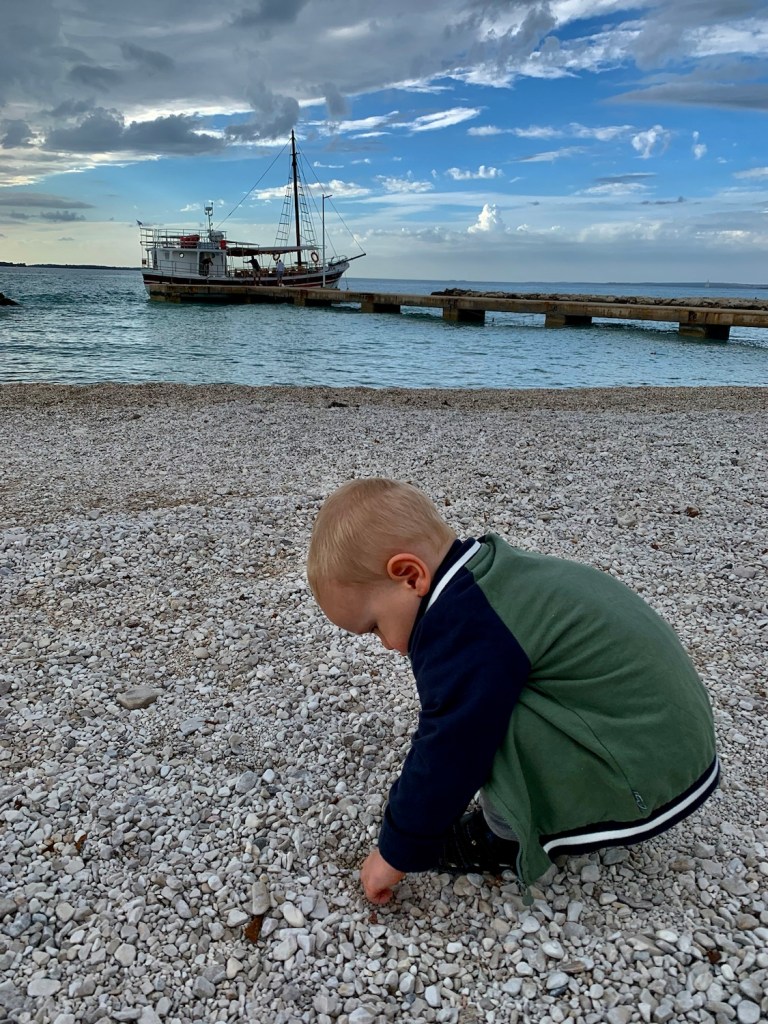 Nicht schön aber was soll man machen. Nachmittags haben wir uns dann noch mal an den Strand getraut und waren sogar alle drei mitunter bis zu den Knien (oder der Windel) im Wasser! Anschließend ging es zum Abendessen ins die Konoba Ulika. Sicherlich gehobene Preisklasse aber dafür auch gehobene Qualität. War echt lecker und Edgar hat auch irgendwann (mal wieder) das Essen von Mama als sein eigenes gegessen…