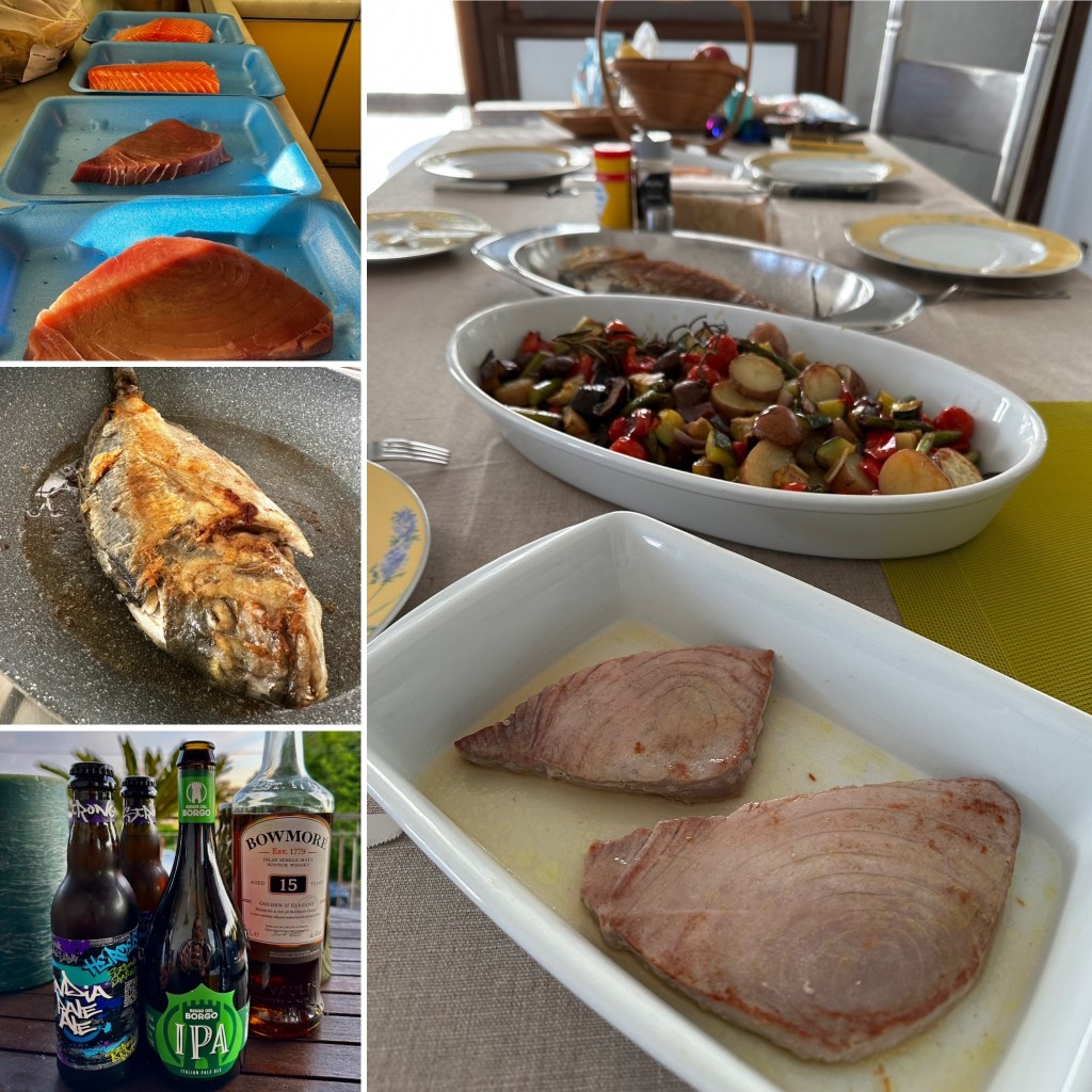 Abends kochen… 3 erlei vom Fisch (Thunfisch, Lachs und Dorade) und jetzt wieder auf der Terrasse sitzen, Blog schreiben, Video bearbeiten und Unterkünfte für in 2 Wochen suchen sowie den morgigen Tag planen.
