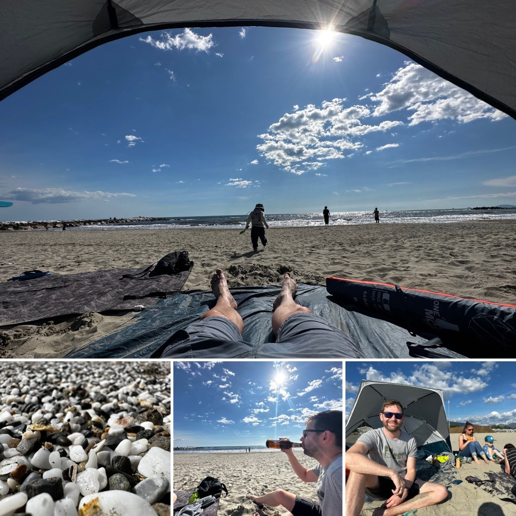 Anschließend haben wir noch ein bissl auf der Terrasse gechillt um dann nach erwachen der Erbfolger an den Strand zu gehen. In der Sonne ist es schon gut warm aber der Wind tut sein bestes um dagegen anzukämpfen… Hier wurde dann gebuddelt und wiederum rumgelegen. Wenig spektakuläres was man hier so mitteilen könnte…