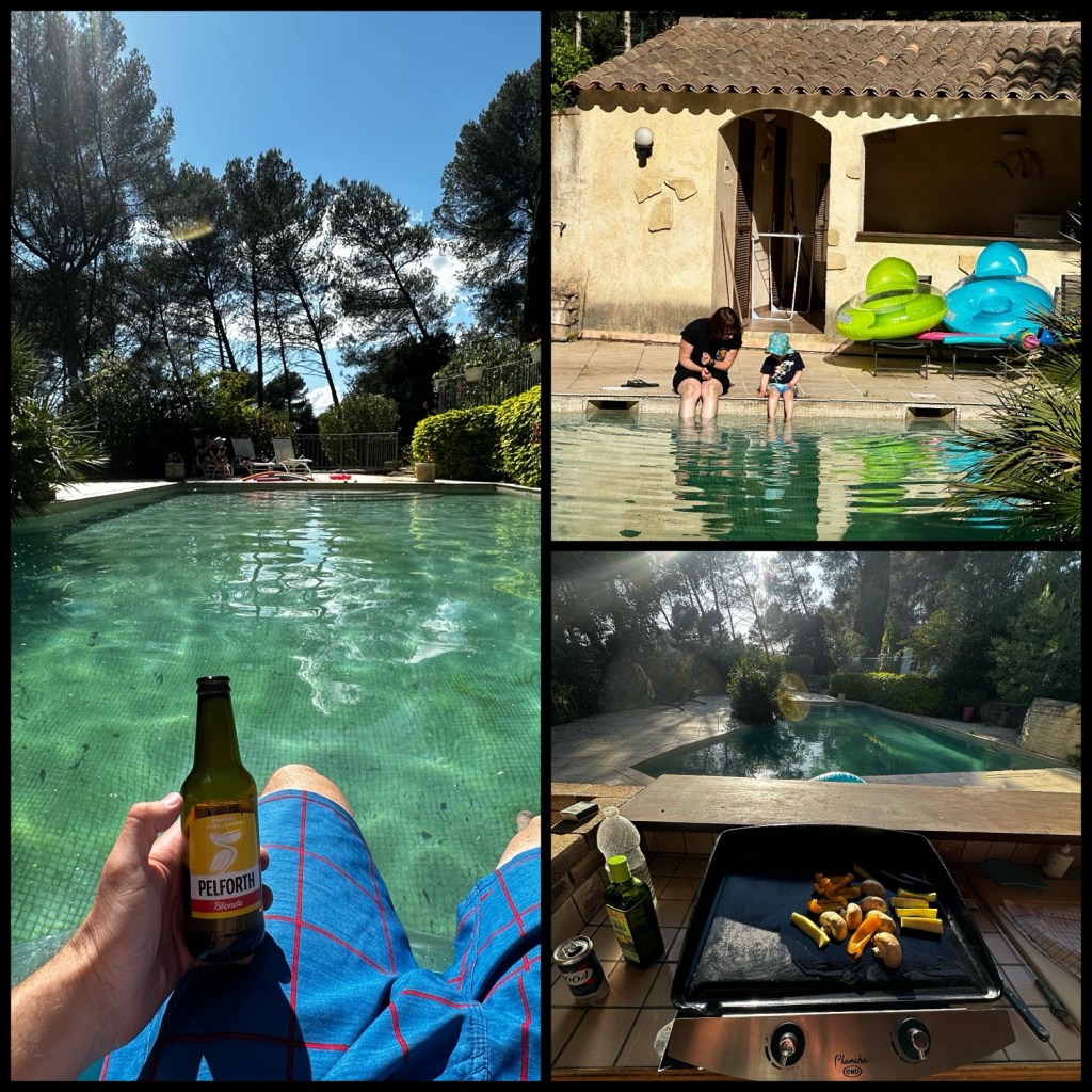 Naja, sind dann noch 1,5 Stunden durch die Stadt getingelt, aber tatsächlich fanden wir Arles und Avignon deutlich schöner als Aix-en-Provence. So haben wir uns dann auf den Weg zum Auto gemacht, sind noch mal in einen hiesigen Decathlon gefahren, um mal wieder eine Strandmuschel zu kaufen (wir besitzen jetzt durch permanente Vergesslichkeit drei Stück), und dann ab zur Butze und in den Pool.