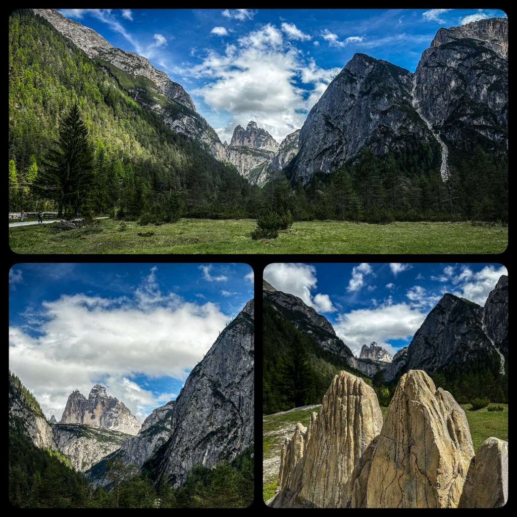 Dann begann der wirklich schöne Teil der Strecke – mit großartigen Landschaften. Weiter ging es bis zu einem Aussichtspunkt auf die Drei Zinnen („Drei Zinnenblick“, Renon). Die Kids waren sichtlich froh, mal aus dem Auto zu kommen und herumrennen zu können. Auch wir als Erzeuger waren froh, uns mal die Beine vertreten zu dürfen. Eine wirklich schöne Ecke – mit atemberaubender Landschaft und perfektem Ort für eine Pause.