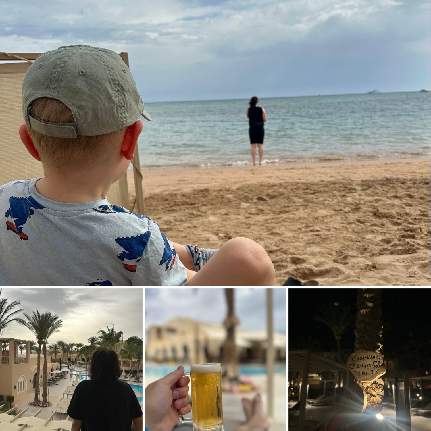 Heute: das Gleiche, nur dass Strand und Pool in der Reihenfolge getauscht wurden. Achja, und das ein „Sandsturm“ den ganzen Tag durchgezogen hat. Kein krasser Wind aber den ganzen Tag diesig, teilweise so diesig das man direkt in die Sonne schauen konnte… diese sah quasi aus wie der Mond durch den Sand und natürlich alles voller sehr feinem Sand. Wir werden uns noch lange daran erinnern…